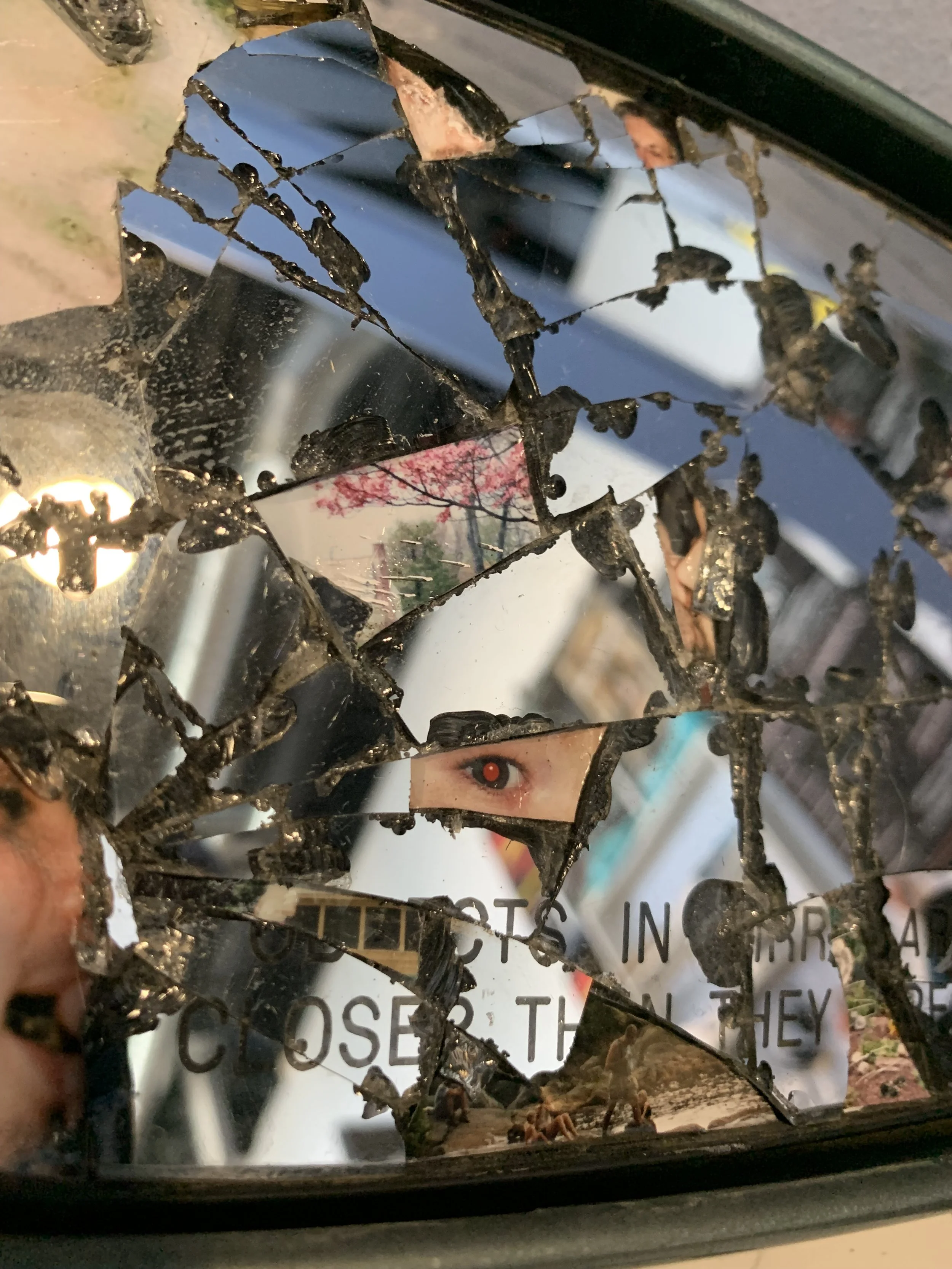 As I alter the pictures, the resonances that have defined my identity change with them. Since I have control in reshaping the images, I have the power to redefine my identity. Mirrors have been a constant symbol in my work, representing the goal of becoming comfortable with the person looking back at me. Additionally, the science of light reflecting and refracting off of reflective surfaces symbolizes how I have tried to block certain things from affecting me which has often led to repression.
